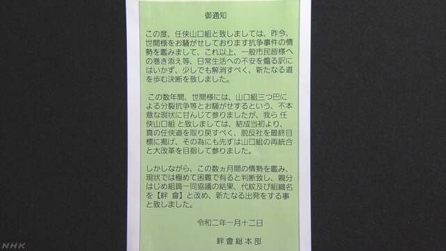 国内最大の指定暴力団山口組から分裂した任侠山口組が組織の名称を「絆會(きずなかい)」と変更したことが、関係者への取材で分かりました。山口組と神戸山口組との抗争が激化するなか「山口組」の名称を外すことで、2つの組織との違いを明確にするねらいがあるとみて警察は確認を進めています。