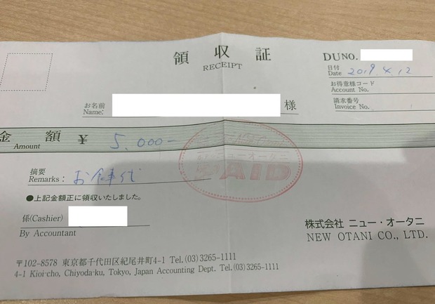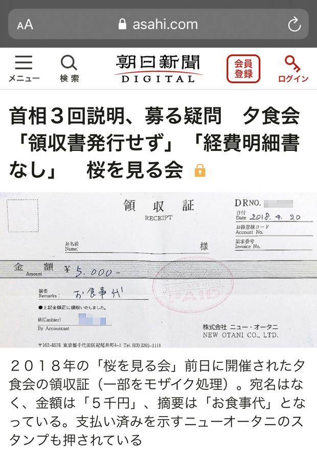 2020.2.5野党が追及する桜を見る会前夜祭の会場となったホテルニューオータニは5日、当サイトの取材に対し「領収書は基本的に複写式の手書きで出している」と回答した。また、宛名のない領収書も先方の都合により発行することがあるとのことで、野党の「手書きは偽物」という追及根拠は完全に崩れた。