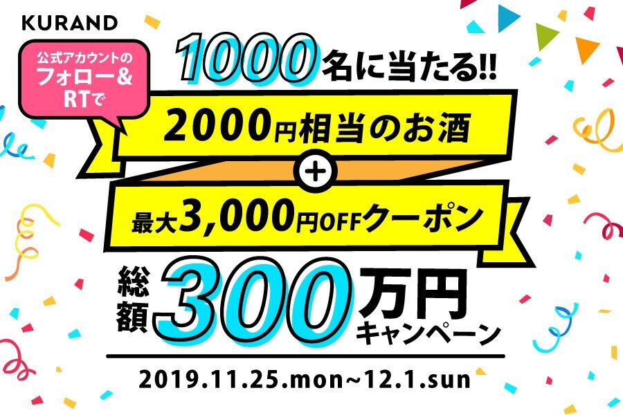 KURAND公式アカウント(@KURAND_INFO)をフォロー&対象のツイートをRTすると、抽選で1000名様に総額300万円分のお酒とクーポンをプレゼントするキャンペーンを、2019年11月25日(月)〜12月1日(日)まで期間限定で開催します。